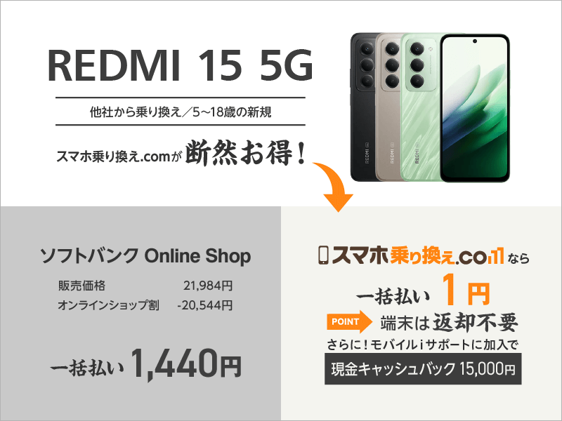 「REDMI 15 5G」は、発売直後なのに一括1円+15,000円CBで発売中!