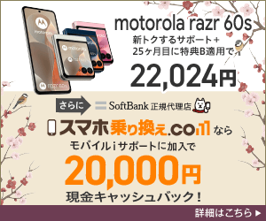 | 月1円 | motorola edge 60s pro | 2年後返却で実質22,024円 (次回もSBで機種変更で実質24円) 返却なしで88,560円 (1円x24回+3,689円x24回) ●独自補償OP(1か月)加入で+20,000円 現金キャッシュバック!(詳細は下記) ※直近180日間で該当機種の購入がある場合は対象外 ※ワイモバイルからの切り替えは対象外 | スマホ乗り換え.com |