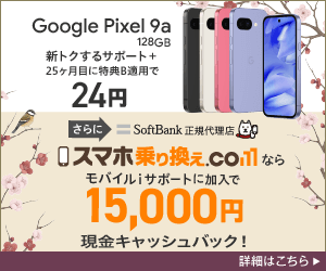 | Google Pixel 9 128GB | 2年後返却で実質34,000円 (次回もSBで機種変更で実質12,000円) 返却なしで116,640円 (500円x24回+4,360円x24回) ●独自補償OP(1か月)加入で+15,000円 現金キャッシュバック!(詳細は下記) ※直近180日間で該当機種の購入がある場合は対象外 ※ワイモバイルからの切り替えは対象 | スマホ乗り換え.com | |