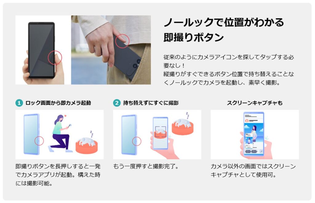 さらに、電源ボタンの下には「即撮りボタン」が追加され、簡単にカメラを起動しすぐ撮影できます。