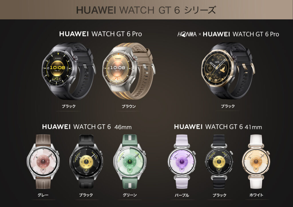 HUAWEI WATCH GT 6 Proは、ブラック以外に、新色のブラウンと、ゴルフモデルのHONMAモデルも発売されます。