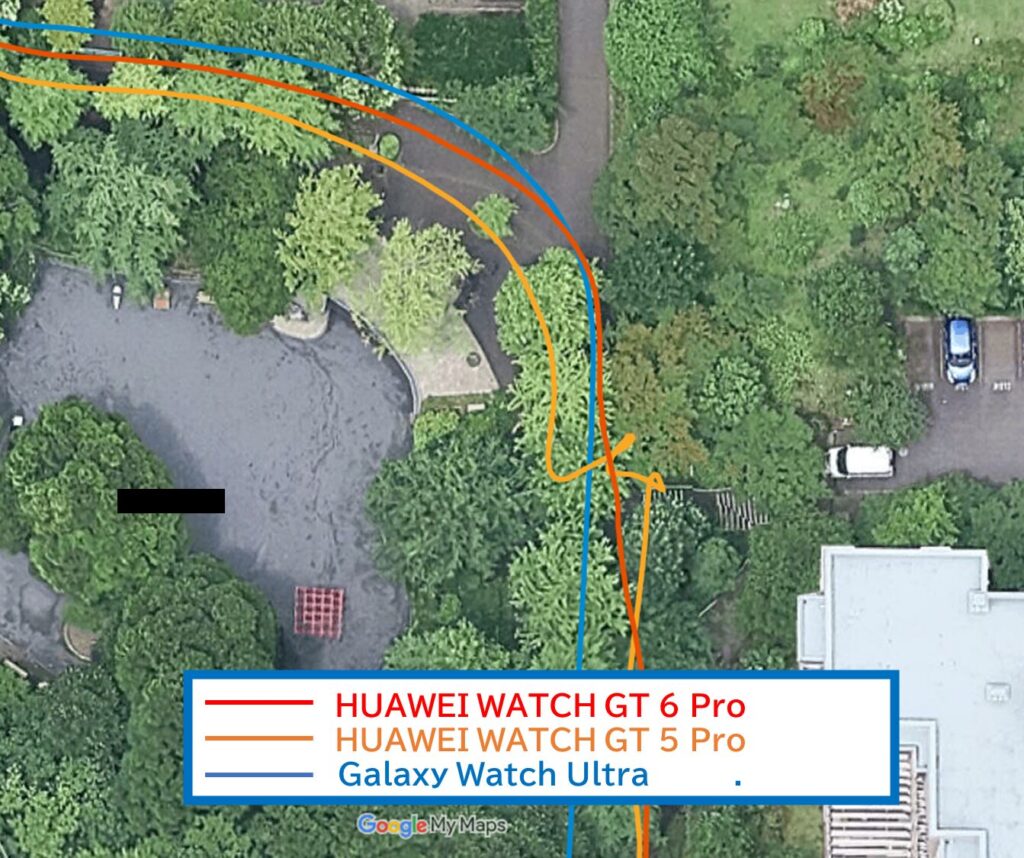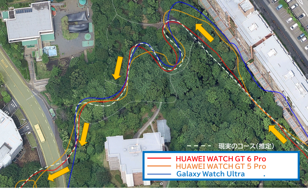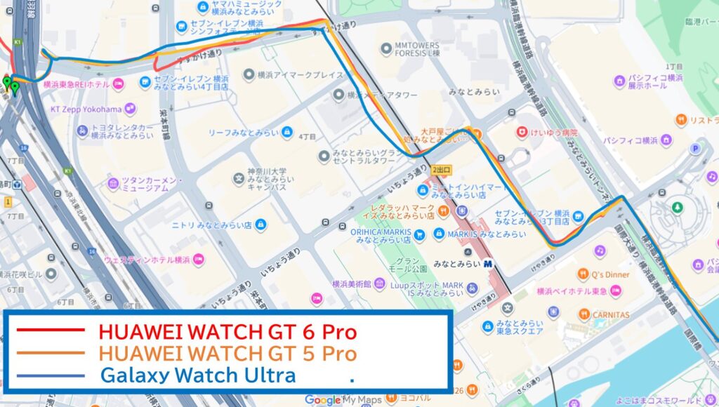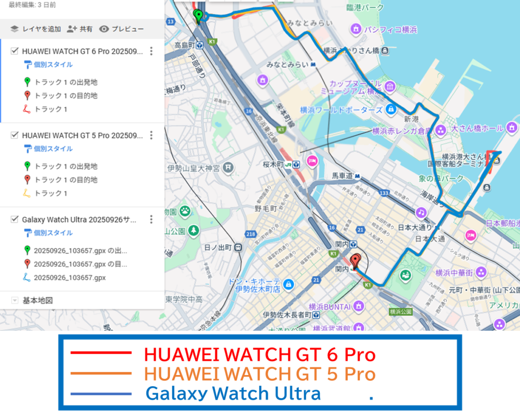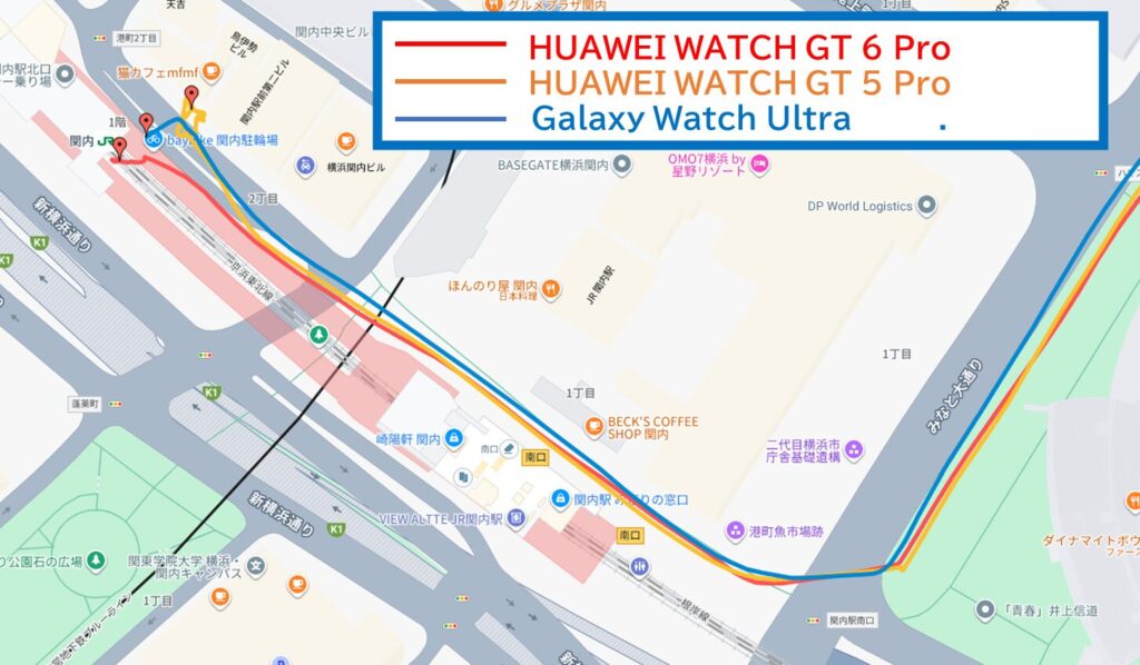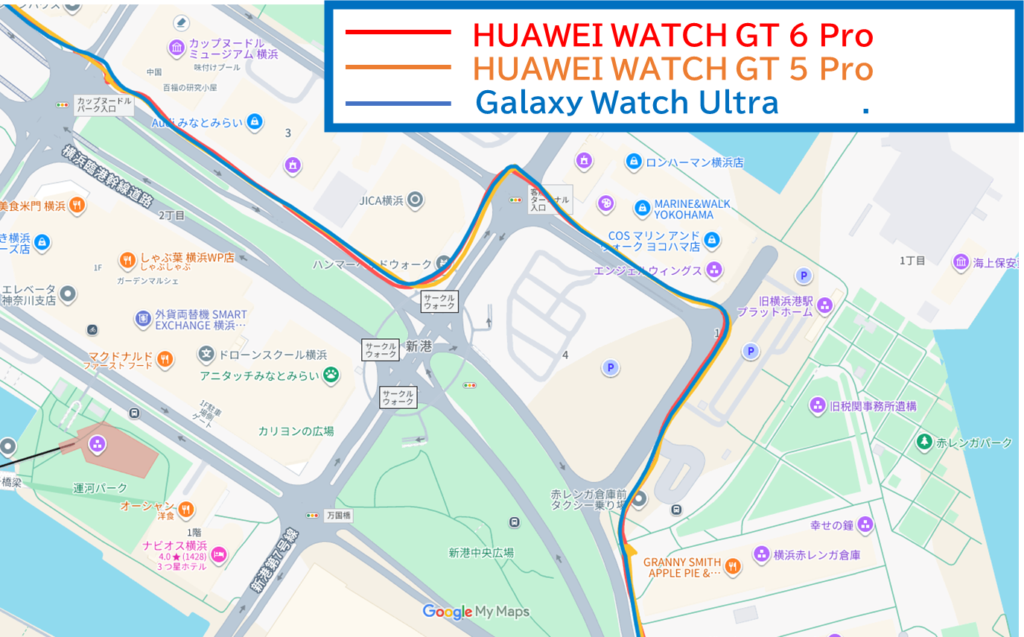 今回のHUAWEI WATCH GT 6 Proと、先代のGT 5 Pro、そしてGalaxy Watch UltraのGPSデータを同一上に加瀬姉合わせています。