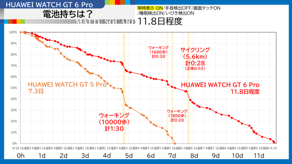 実際に電池持ちを測定すると、ウォーキングやサイクリングを合計4回挟んでいますが、常時表示ON・手首検出OFFの状態で11.8日程度利用可能でした。