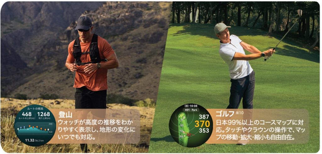 運動機能もGPSの精度が非常に高く、今回はサイクリングの機能がかなりうれしいところ。ゴルフ・登山・スキーなど幅広いアクティビティで使えます。