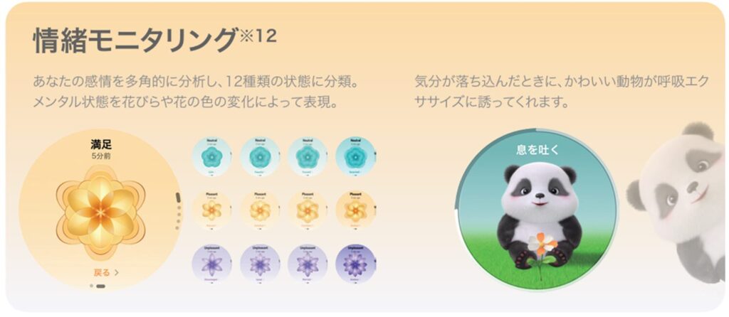 情緒測定も進化しています。12段階に分かれた表示になっている他、今の自分の気持ちを記録することもできるようになります。