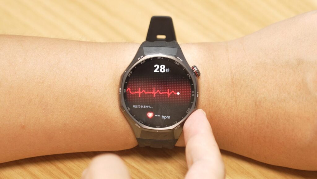 ECG(心電図測定)も、医療認証を取得しており、右下のボタンが電極になっていて測定可能です。