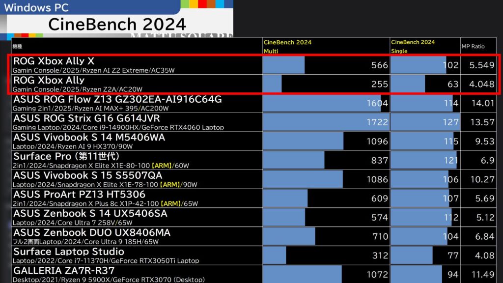 CineBench 2024では、ROG Xbox Ally Xがマルチ566/シングル102、ROG Xbox Allyがマルチ255/シングル255となっています。