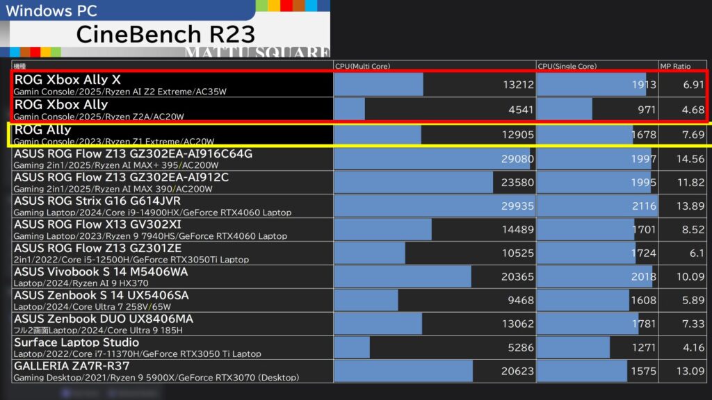 また、2023年発売のROG Allyと比べると、ASUS ROG Xbox Ally Xは1.4倍程度に伸ばしているのも印象的です。