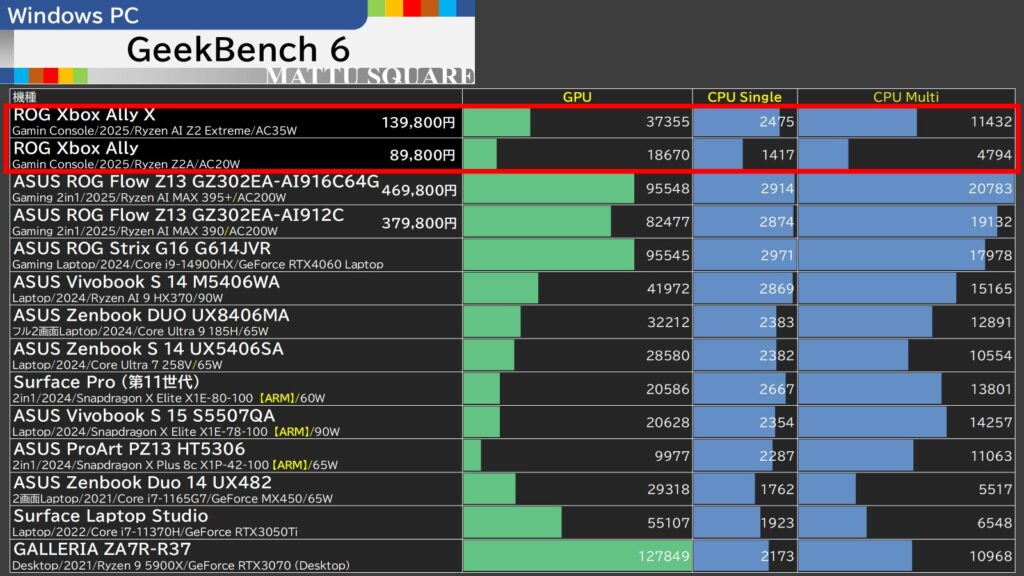 GeekBench 6ではこの通りで、ROG Xbox Ally XのCPU性能はやはりCore Ultra 258Vとだいたい同等程度。