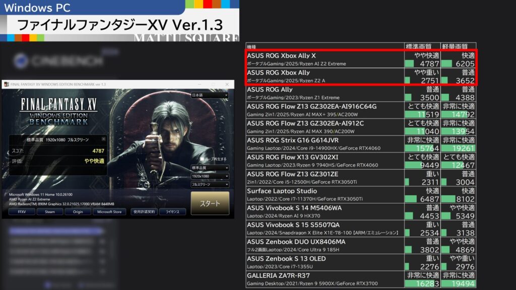 ファイナルファンタジーXVでは、Ryzen AI 7 HX370など、CPU性能では同等だったモバイルノートPCよりも少しスコアを伸ばしています。