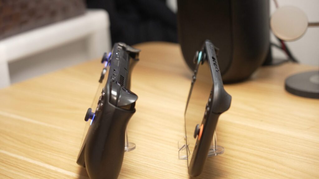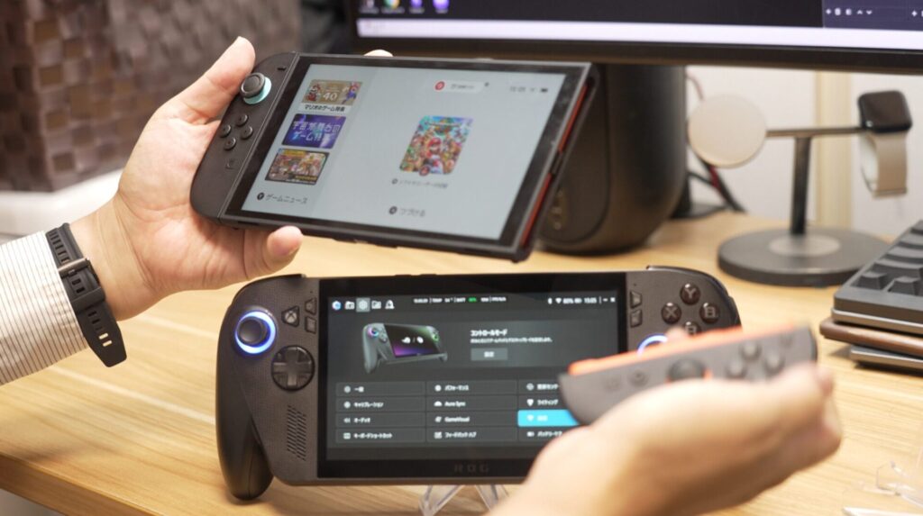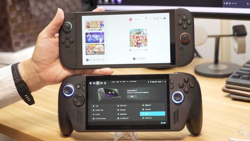Nintendo Switch 2のほうが薄くて持ち歩きには便利ですが、ROG Xbox Ally Xのほうがグリップ感はあります。