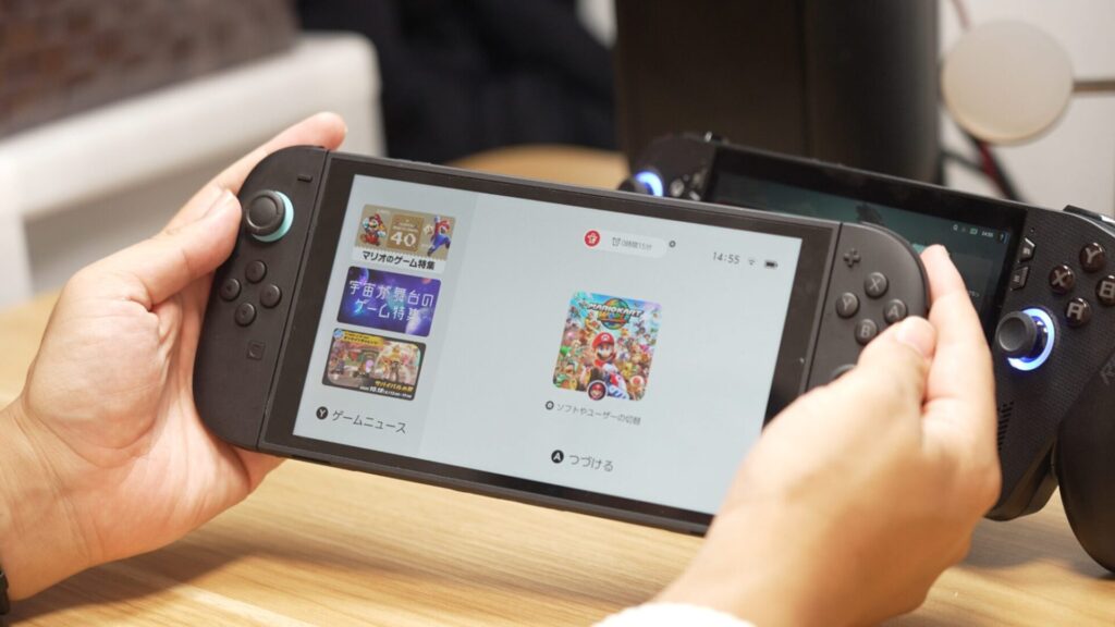 Nintendo Switch 2は、(Windows搭載機ではないため性能等を比較することは難しいですが)、握るというよりは手のひらに置いてプレイをする感じです。