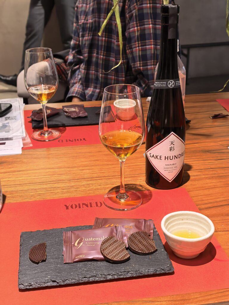 今回のメディア向け発表会では、高級日本酒ブランド「SAKE HUNDRED」が誇る、濃密な味わいが際立つデザート日本酒「天彩(あまいろ)」とのペアリングを楽しめました。