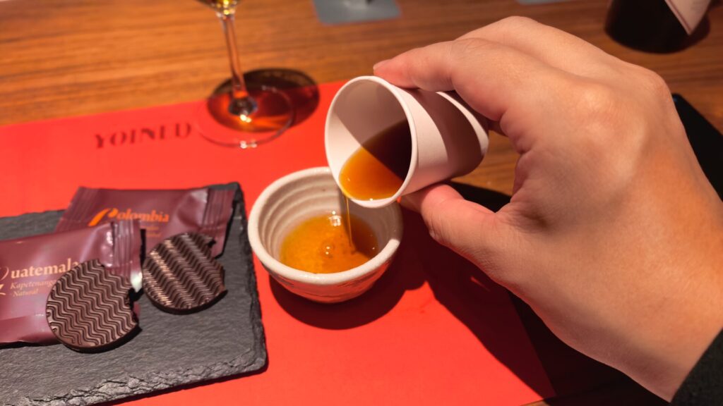 そして、今回ペアリングとして、同じ「天彩(あまいろ)」を使いつつも、冷酒にはコロンビア、熱燗にはグアテマラをおすすめされています。