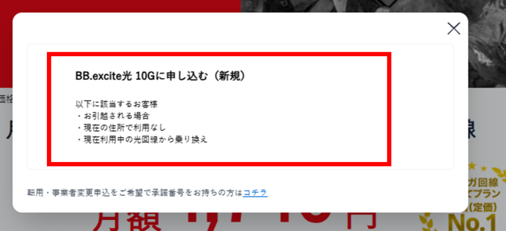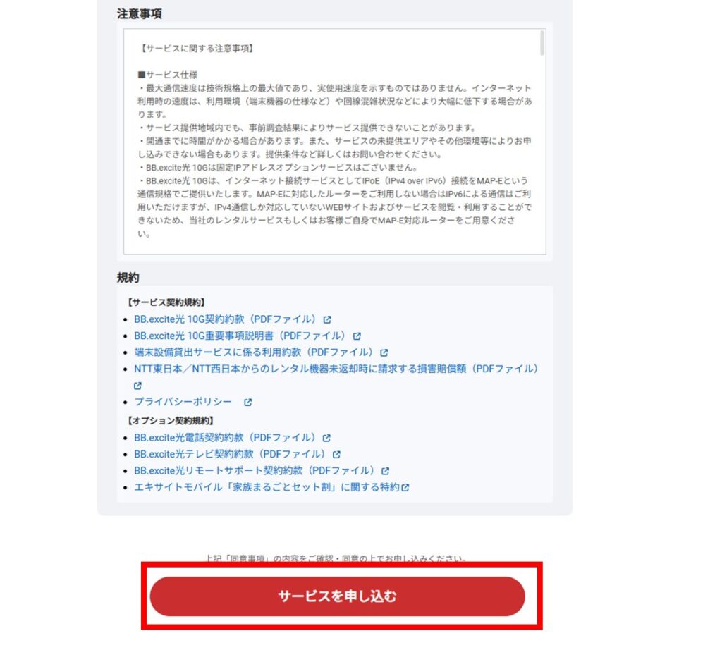 「BB.excite光 10Gに申し込む(新規)」がボタンになっていますので、タップします。