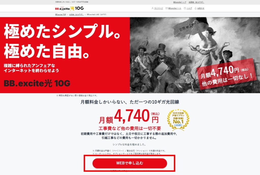 BB.excite光 10Gのトップページから、「WEBで申し込む」のボタンをタップします。