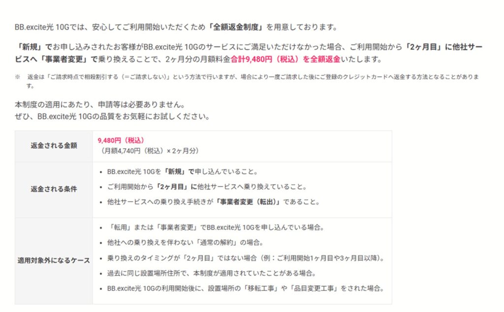 BB.excite光 10Gでは、新規申し込み後満足できなかった場合、利用開始2か月目に「他社サービスへの事業者変更」で、9,480円(税込)を全額返金されます。