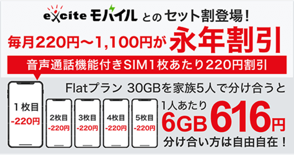 例えば、家族で30GBを契約して、データを分け合えるデータシェアも使えますので、最大5人で30GBを分け合う場合、BB.excite光 10Gとのセット割も含めると、1人あたり616円(税込)で約6GBまで利用できます。