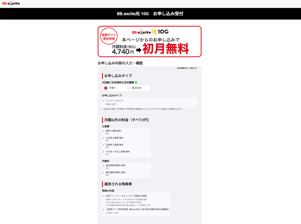 工事費・手数料はすべて無料、特典も、ESETファミリーセキュリティ永年無料と、「【提携サイト限定特典】BB.excite光 10G 初月月額利用料全額無料 4,740円 → 0円」と記載があるはずです。