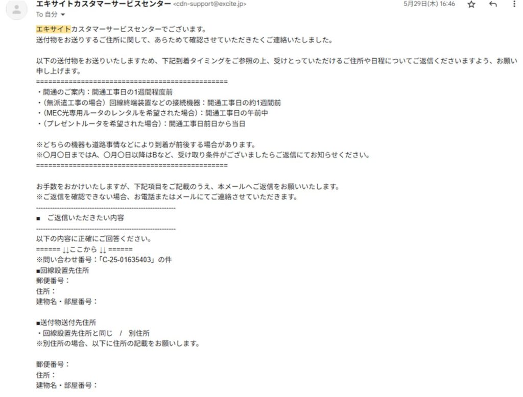 まずは、申込当日に「送付物送付先住所」をメールで尋ねられました。