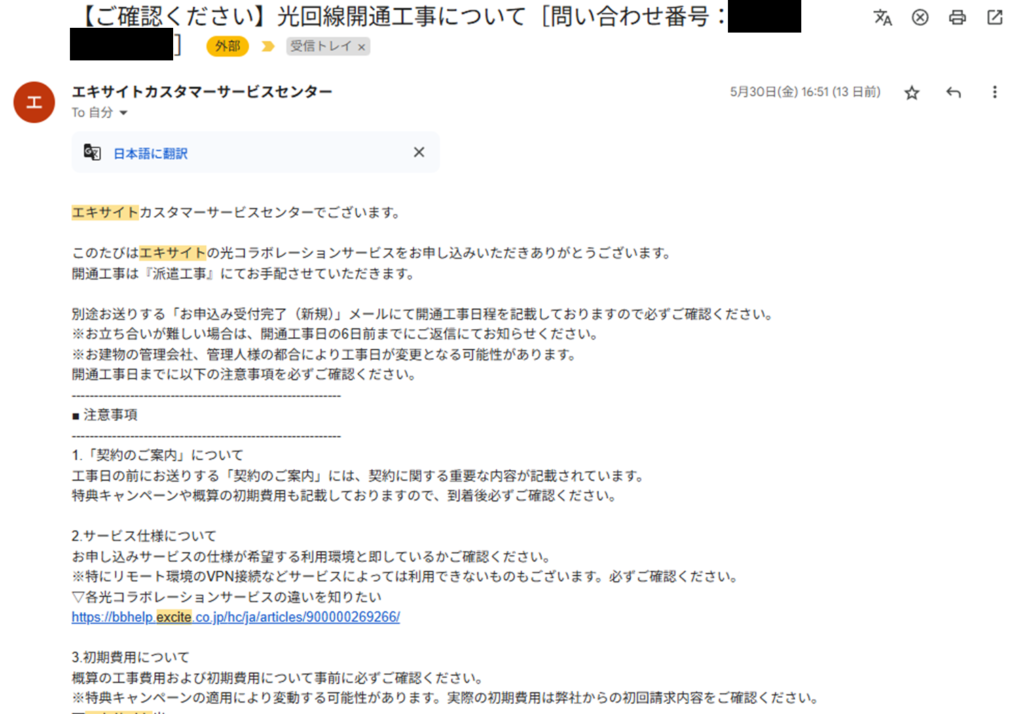 申込翌日には、契約の注意事項がメールにて配信されています。
