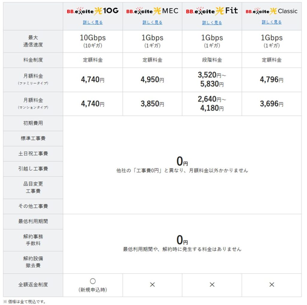 | BB.excite光 10G | MAP-E、DS-Lite選択可能 | 4,740円(税込) |
