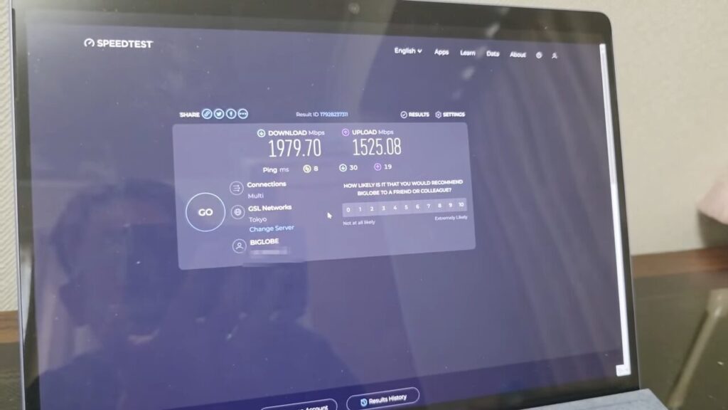 PCでは、速度は下り1979Mbps、上り1525Mbpsが出ていました。