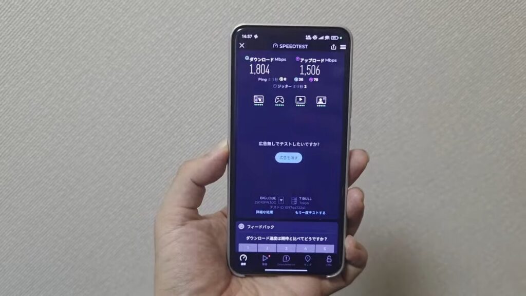 スマホでも、速度は下り1804Mbps、上り1506Mbpsと非常に高速でした。