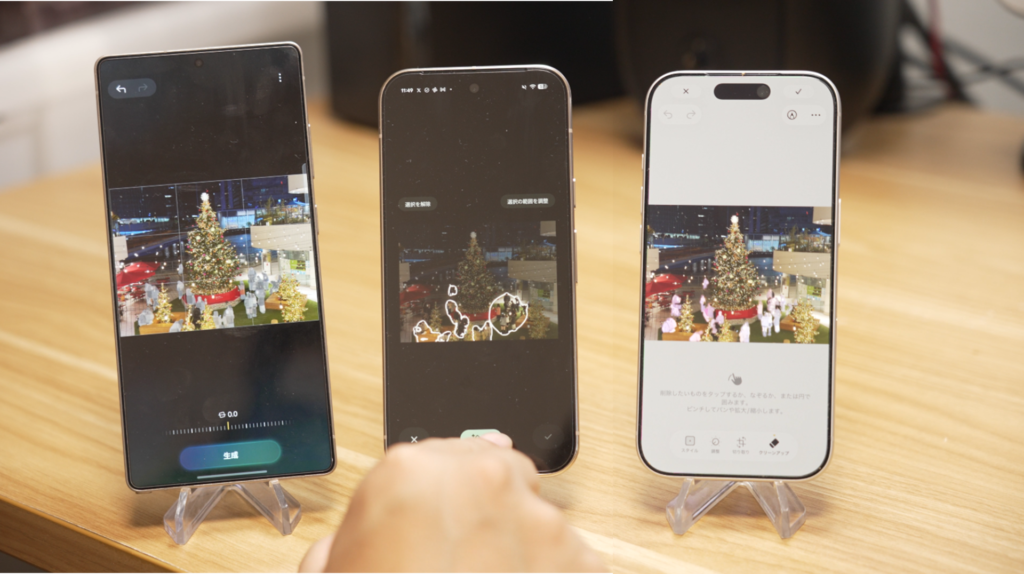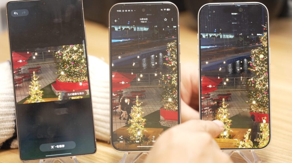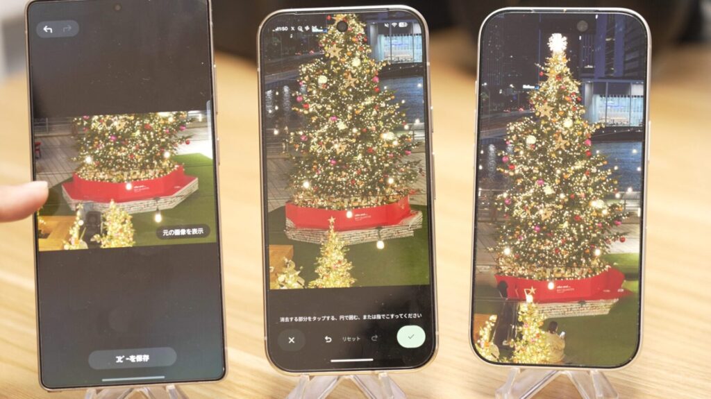 クリスマスツリーのいすの部分に何人かが腰を掛けていましたが、それを消去しても元々の形とほぼ同等の形を再現できたのはGalaxy S25 Ultraだけです。