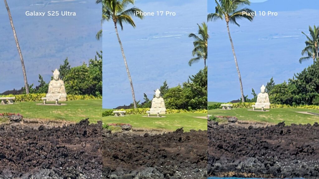 - 色合いは、Galaxy S25 Ultraは少しだけ青め、iPhone 17 Proは少し黄色め、Pixel 10 Proは赤めな傾向