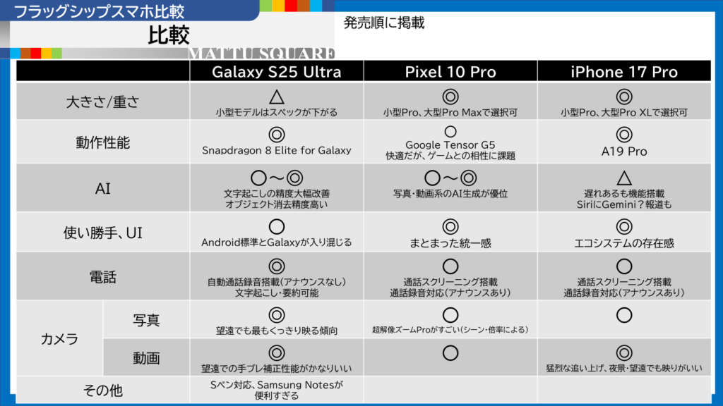 Galaxy S25 UltraとPixel 10 Pro、iPhone 17 Proの3者を比較して、どれを選ぶべきか、MATTUが長期間いろいろ使った評価をまとめると以下の通りです。