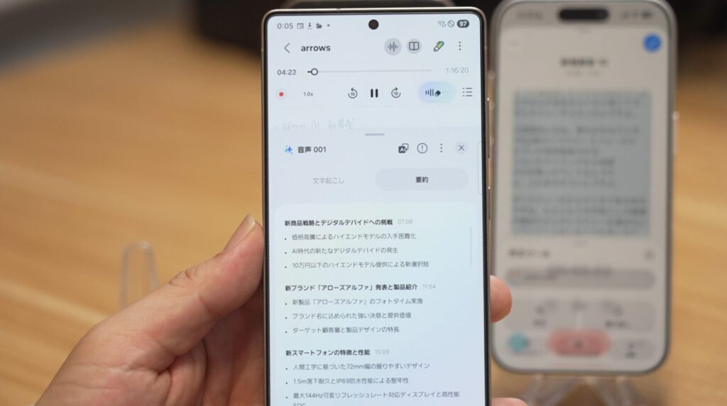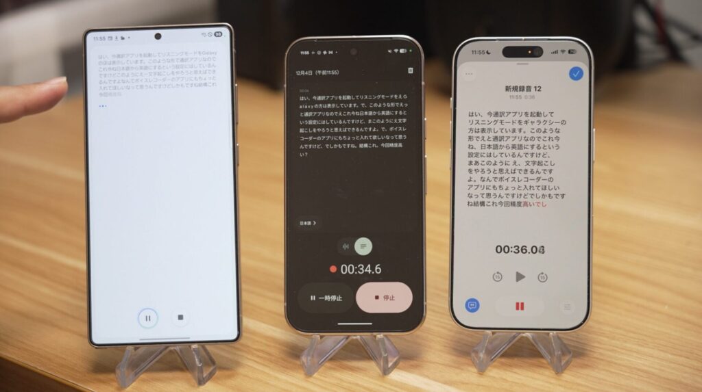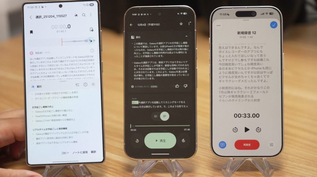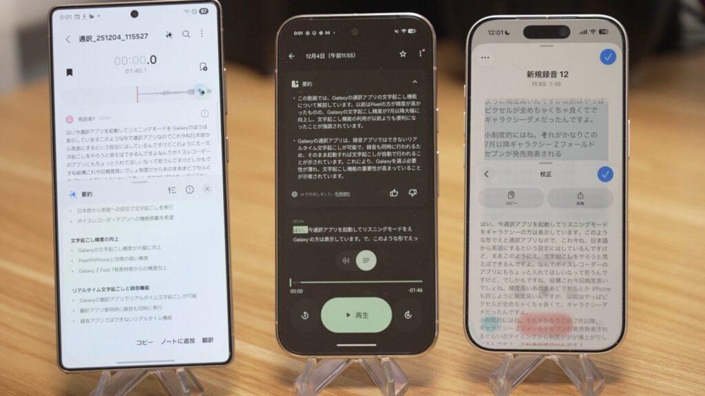リアルタイム文字起こしについてはPixel・iPhoneでは行えるものの、Galaxyではできないのですが、要約や翻訳が制約なく使えるのはGalaxyのメリットです。精度も大幅に改善し、かなり満足して使えています。
