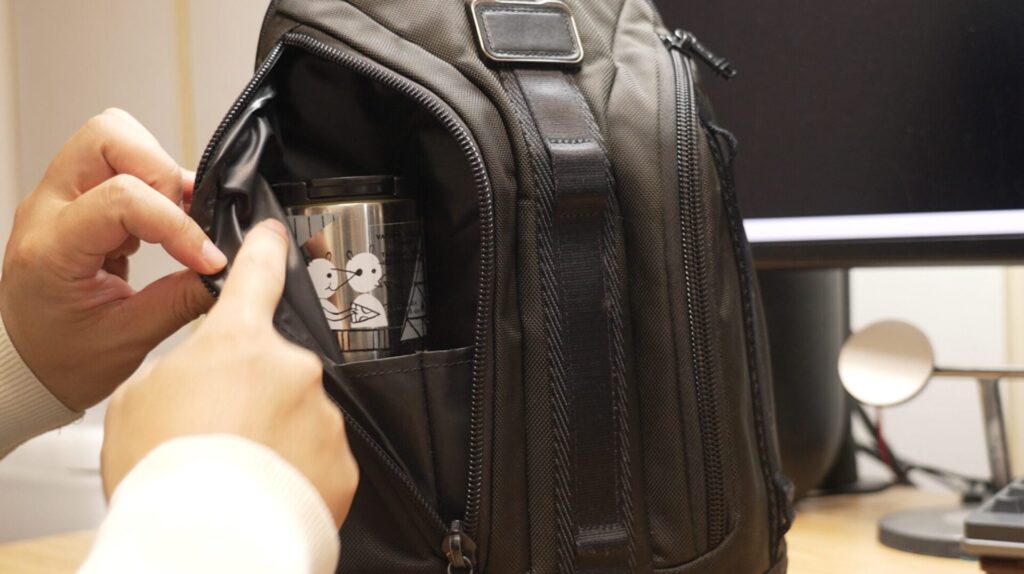 立体的なフォルムで、前面には2つのポケットがあり、片方は防水対応になっているため飲み物や折り畳み傘なども入れられます。