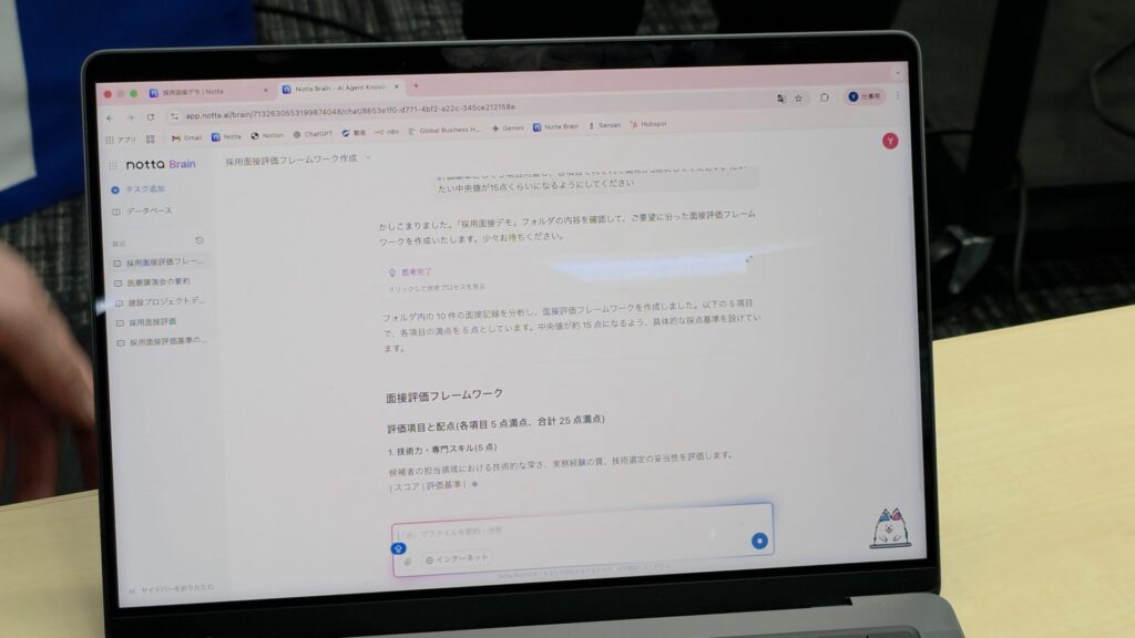 例えば、採用の際に面接した音声データを蓄積して、Notta Brainで「面接の評価フレームワークを作成してください」とNotta Brainに指示をすると、面接内容を読み込んで具体的な評価基準を作成してくれます。
