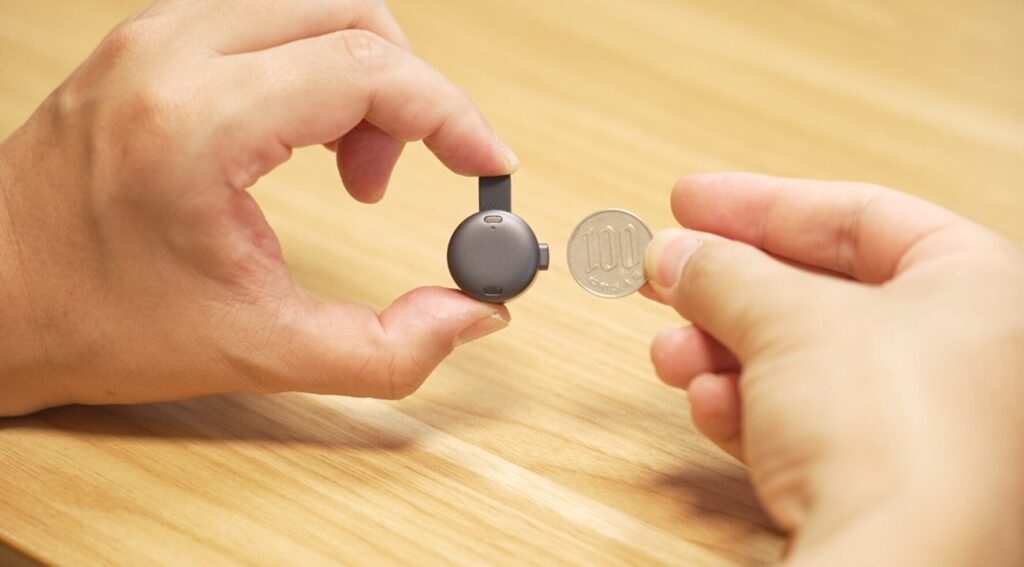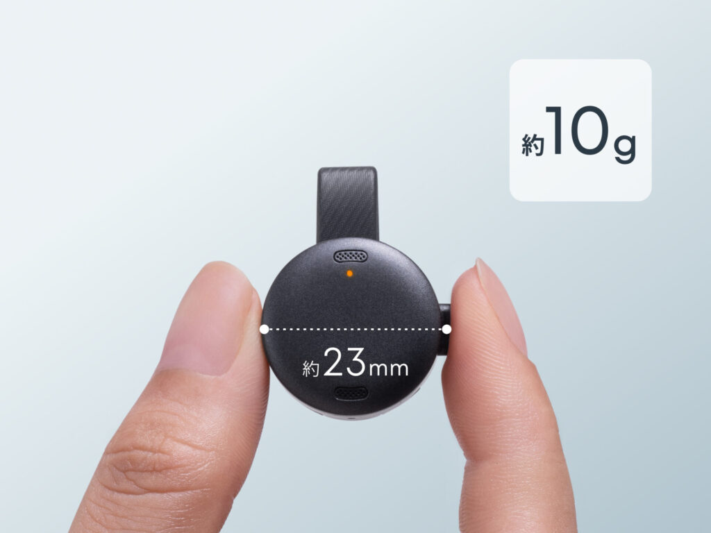 小型で軽く、胸元につけたり、ネックレスのようにぶら下げてスタイリッシュに身に着けることもできますし、スマホ裏にくっつけられます。