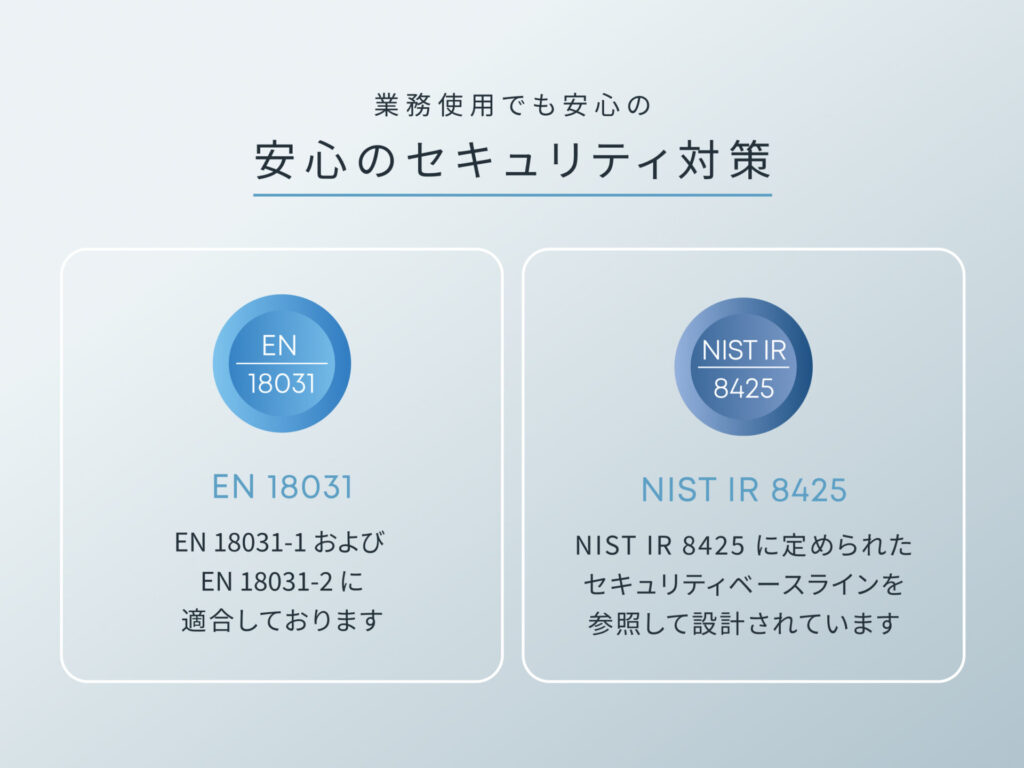 EN18031-1、EN18031-2に適合、だったり、NIST IR 8425に定められたセキュリティベースラインを参照して設計などしっかり規格に適合して設計されており、安心して利用できます。