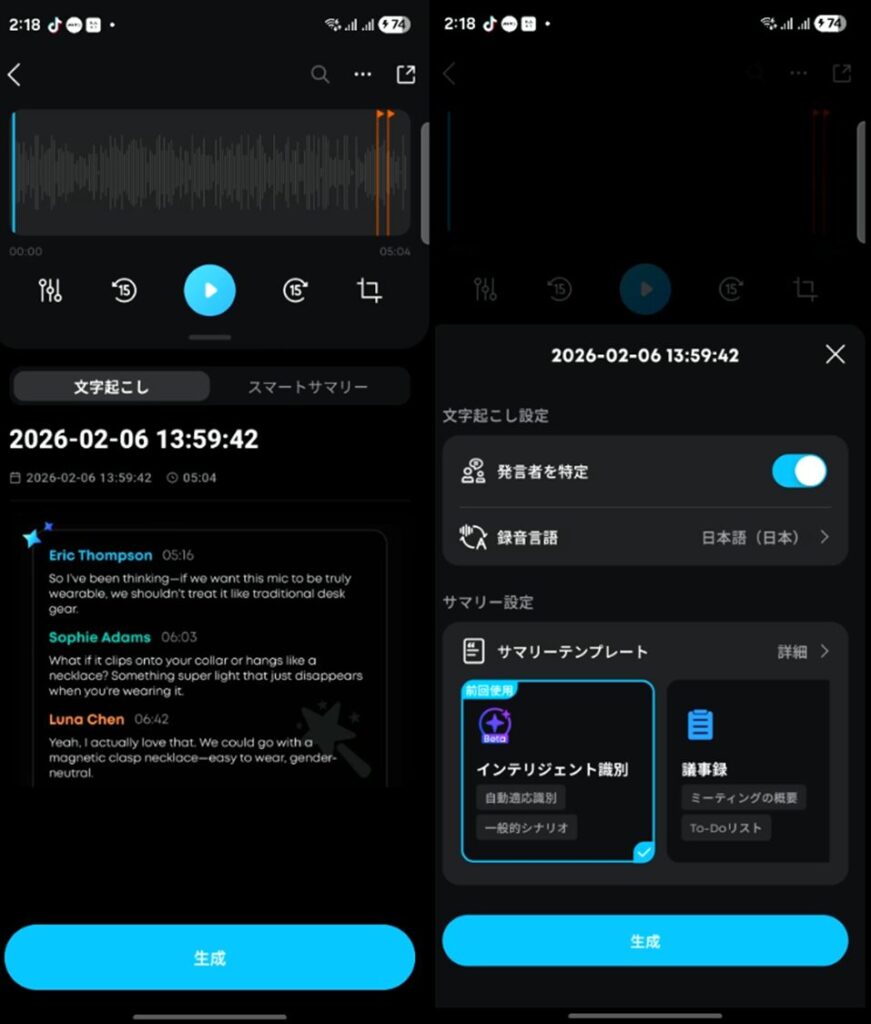 スマホへ転送した録音データは、「生成」のボタンを押すと、文字起こしと要約を生成できます。