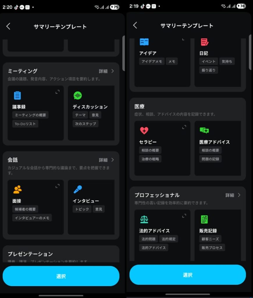 また、医療現場で医師や看護師が使う際には「医療」のテンプレートが、弁護士の方には「法的アドバイス」、建設弁場では「建設現場の記録」など、専門性に即したテンプレートも用意されています。