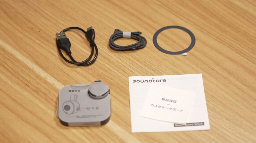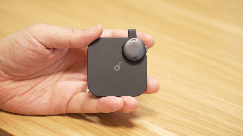 小さくて軽いSoundcore Workは、マイク本体とカード型充電ケースで構成されています。
