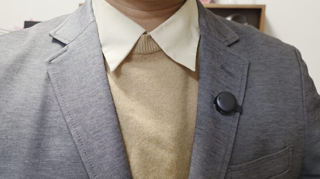 ジャケットを着ていれば、クリップのように簡単に襟元にくっつけられます。