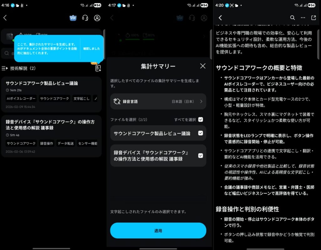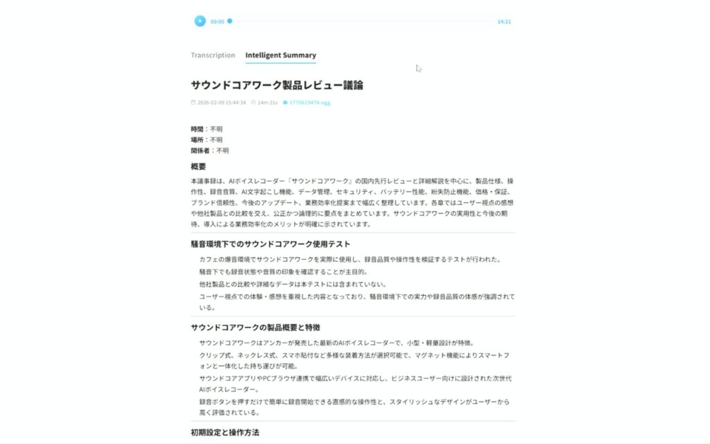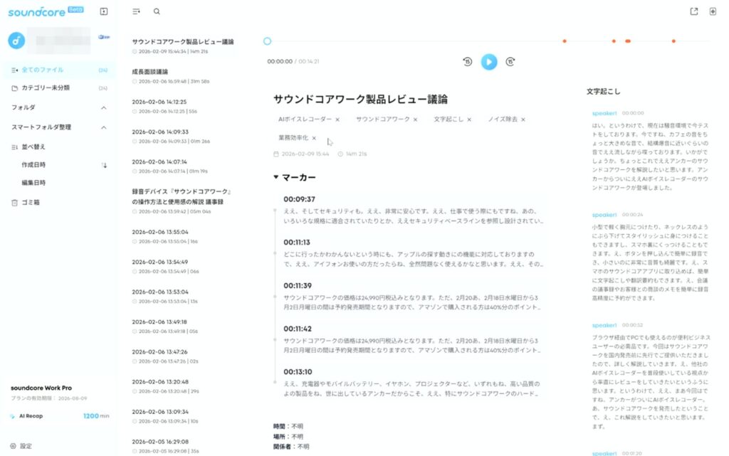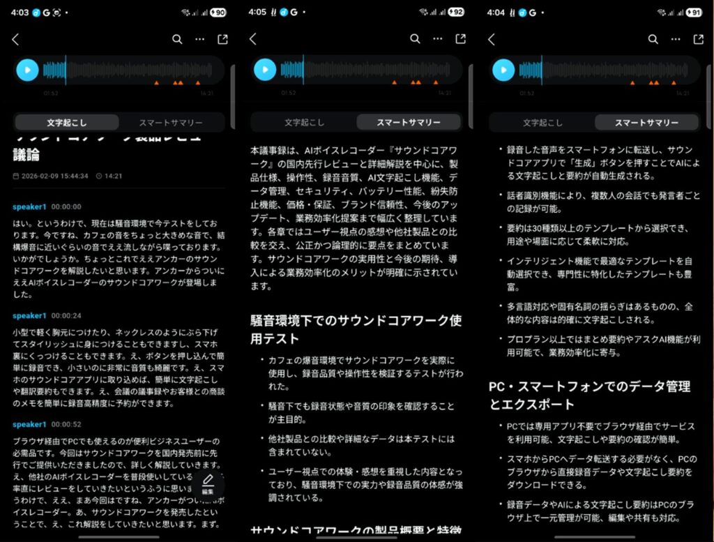 スマホのSoundcoreアプリに取り込めば簡単に文字起こしや翻訳・要約もできます。