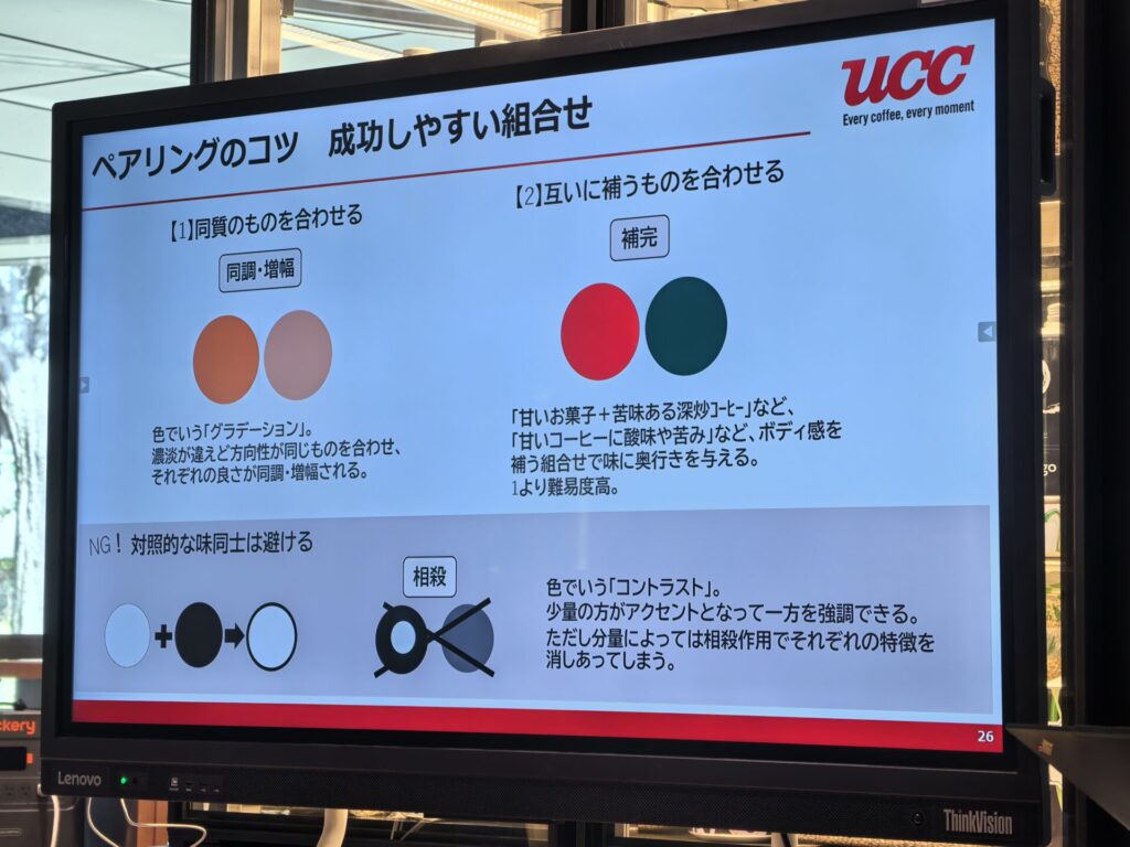 中井講師からは、フードペアリングのコツとして「同じ系統の味を合わせる(例:フルーティーなコーヒーとフルーツケーキ)」か「互いに補い合う味を合わせる(例:塩鮭と酸味の強いコーヒー)」というヒントが紹介されました。