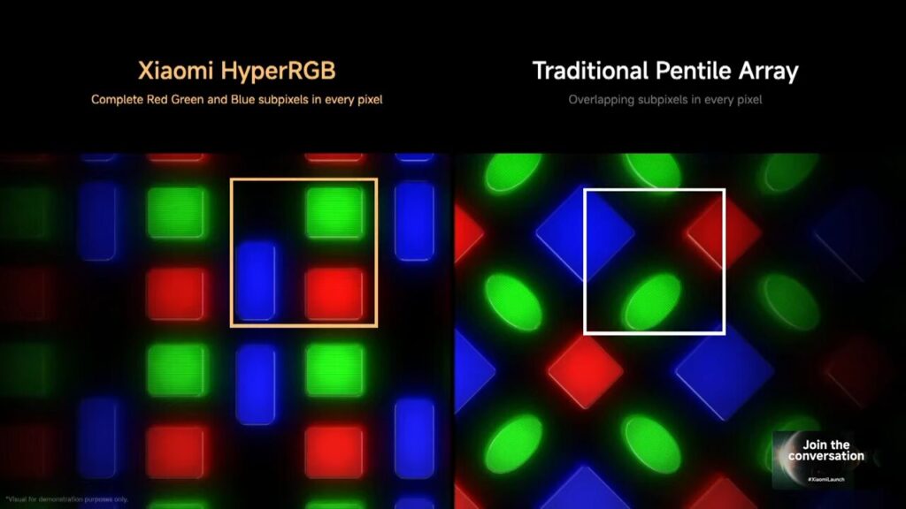 従来のディスプレイパネルがサブピクセルを重複させていたのに対し、HyperRGBは全てのピクセルが完全なRGBサブピクセル配列となっています。