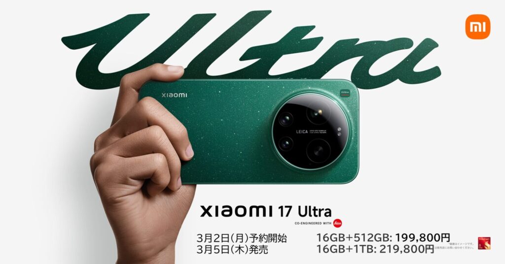 Xiaomi 17 Ultraは、16GBメモリ / 512GBストレージで199,800円(税込)、16GBメモリ / 1TBストレージ:219,800円(税込)となっています。