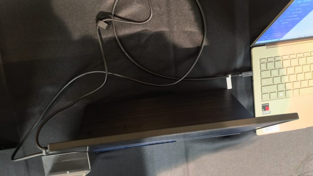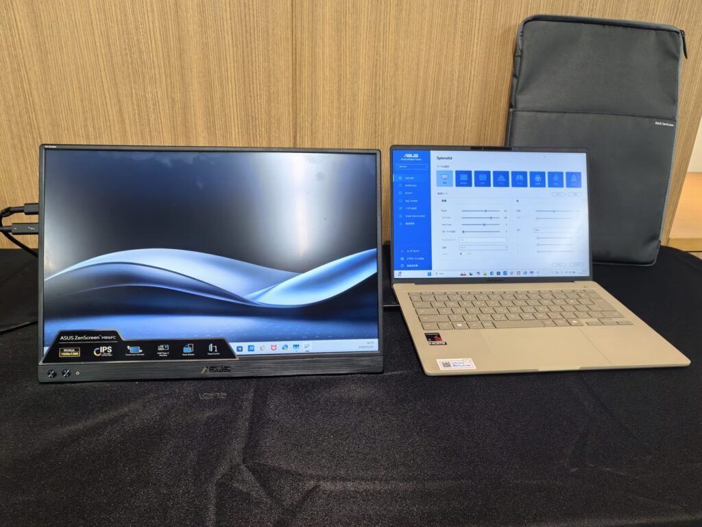 ASUS ZenScreen MB16FCは、ノートPCと一緒に外出先に持ち運んで使えるポータブルモニターです。