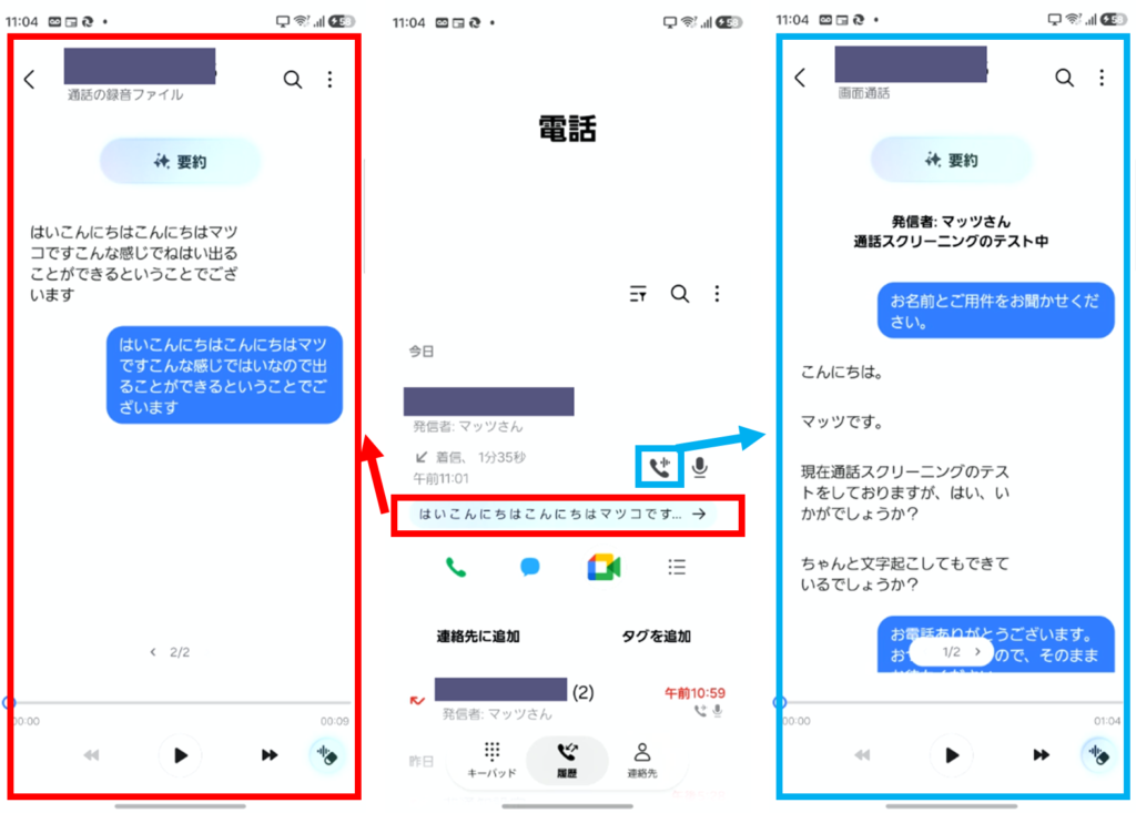 受話器(水色の四角でかこったアイコン)をタップすると、通話スクリーニングの録音内容が表示されます(一度「要約」をタップすると、要約データに挿し代わります)。