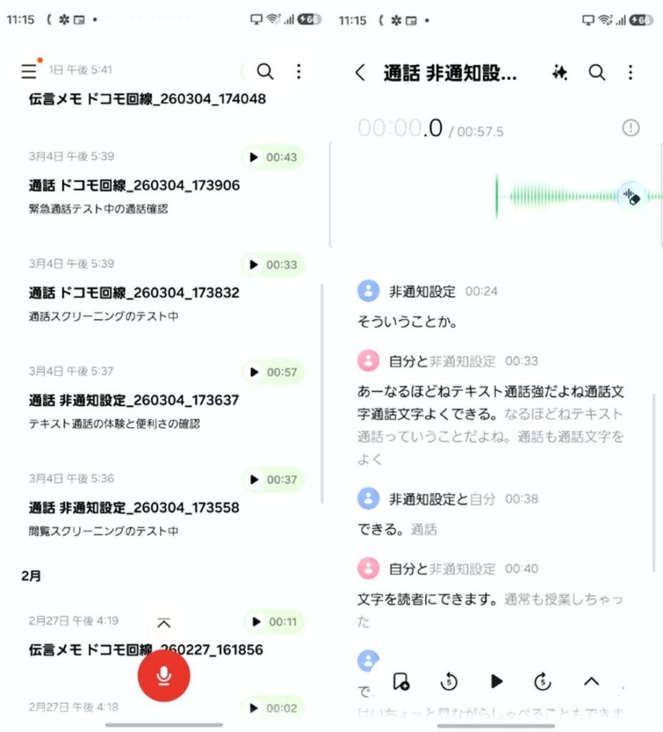 一方、その下の水色の長いバーには通話文字起こしの文字が刻まれており、これをタップすると通話録音ファイルと文字起こしデータが表示されます。