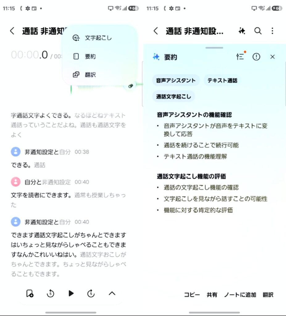録音音声自体はストレージに保存されているので、随時PCなどにバックアップも取れますし、「ノートに追加」をタップすればSamsung Notesに保存することも出来ます。
