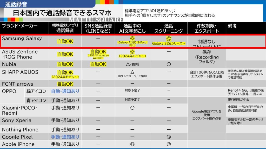 他社スマホの通話録音・通話スクリーニングの対応状況を、MATTU調べでまとめた表が以下の通りです。