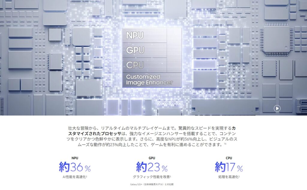 Galaxy向けにカスタマイズされ、先代と比べCPUは17%、GPUは23%、NPUは36%の改善を実現しています。